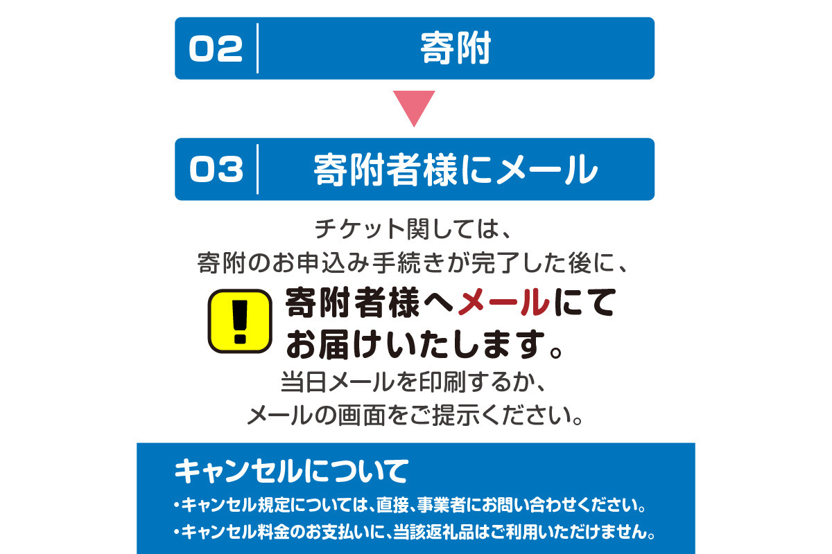・チケットは、寄附のお申込み手続きが完了した後に、寄附者様へメールにてお届けいたします。当日メールを印刷するか、メールの画面をご提示ください。