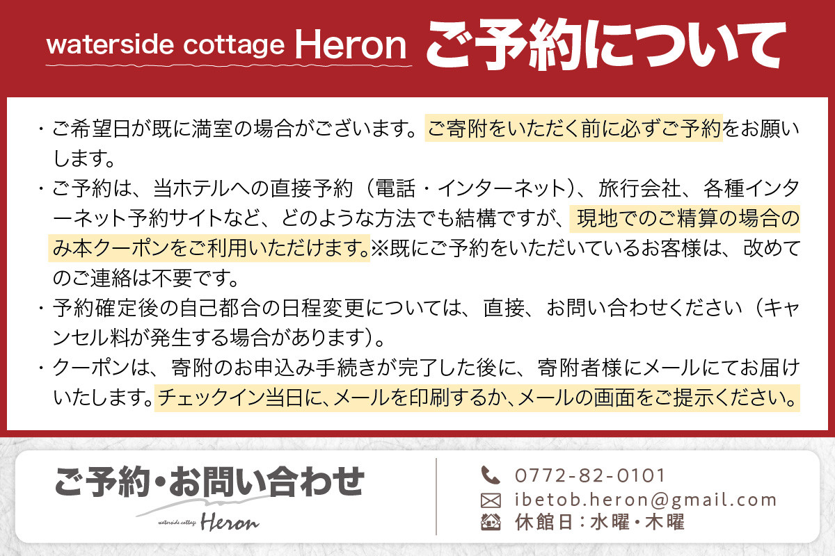 waterside cottage Heron ご宿泊クーポン 6,000円分 HE0001020,000 円 久美浜湾の畔に佇む、穏やかな水辺の風景と季節の草花に囲まれた、2室だけの小さなホテルです。 天然素材で仕上げた内装や、使い心地にこだわった寝具やリネン、季節の食材を楽しむ食事など、シンプルで心地のよい空間で、カントリーサイドの友人の家で過ごす週末のように、のんびり、肩の力を抜いて過ごして頂ければ幸いです。 お食事は地元食材、自家農園の野菜を使ったシンプルな欧風家庭料理です。 自然豊かな久美浜の季節それぞれのおいしさをお楽しみいただけます。 どこか懐かしい久美浜の街並み散策もおすすめです。 ≪ご予約等について≫ ・ご希望日が既に満室の場合がございます。ご寄附をいただく前に必ずご予約をお願いします。 ・ご予約は、当ホテルへの直接予約(電話・インターネット)、旅行会社、各種インターネット予約サイトなど、どのような方法でも結構ですが、現地でのご精算の場合のみ本クーポンをご利用いただけます。※既にご予約をいただいているお客様は、改めてのご連絡は不要です。 ・予約確定後の自己都合の日程変更については、直接、お問い合わせください(キャンセル料が発生する場合があります)。 ・クーポンは、寄附のお申込み手続きが完了した後に、寄附者様にメールにてお届けいたします。チェックイン当日に、メールを印刷するか、メールの画面をご提示ください。 【ご予約・お問い合わせ】 waterside cottage Heron TEL:0772-82-0101 メール:ibetob.heron@gmail.com 休館日:水曜・木曜 ≪ご利用について≫ ・1回の精算にご利用いただける枚数や人数に制限はありません ・各種キャンペーン等の割引との併用は、併用先のキャンペーン等が併用不可の場合を除きご利用いただけます ・本クーポンは、当ホテルでのご宿泊にご利用いただけるクーポンです - 常温便