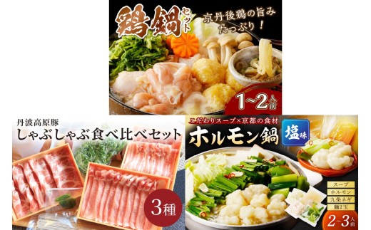 京丹後のおすすめ鍋セット3種の定期便(毎月1回×3ヶ月)です。 ■京都・京丹後の若鶏と九条ネギの鶏鍋セット 自然豊かな京都府北部・京丹後市で育った健康で美味しい若鳥のとり肉と、ふんわりとしたつみれが入った、温かくて心地よい鶏なべ料理です。 さらに、京都の冬の代表的な野菜である九条ねぎもたっぷり入れて、野菜と肉の旨味がたっぷり詰まった鍋をお楽しみいただけます。 京丹後産の若鶏のトリニクは、プリプリしており、本来の鶏肉のうま味が口の中に広がります。 一度食べればリピーターが多いこの鶏鍋の味を、ご家庭でお手軽にお楽しみいただけます。また、家族や友人と集まって、一緒に食べると、心も温まる、身体も温まる、そして会話も弾む、思い出に残ること間違いなし。 ぜひ、わかどりと九条葱のとりなべを食卓に取り入れ、身体への栄養補充と心の充実を感じてください。 ■トン’sキッチン 京丹波高原豚 しゃぶしゃぶ食べ比べセット 京丹後市の道の駅、丹後王国食のみやこの中にあるトン’sキッチンの人気料理。 京丹後市産の九条葱と厳選された豚肉を地元の桔梗屋醤油のお出しで頂くしゃぶしゃぶです。 ■日本海牧場のホルモン鍋(塩味) 牛骨を長時間弱火で煮詰めたスープに京丹後の海水から焚き上げた日本海牧場の翁乃塩を加え、ぷりぷりのホルモン(250g)・こと京都さんの京都産九条ねぎ・地元小塚製麵さんの生麵をセットにした商品です。 【注意事項】 ・画像はイメージです。 ・生食の場合は賞味期限内に使用し、賞味期限経過後は十分過熱調理してください。 ・鶏鍋セットのとりにくは、よく加熱してお召し上がり下さい。 ・配送日の指定は承れません。 ・事前連絡をいただいていないご転居・ご不在等や、寄附者様のご都合で返礼品をお受け取りいただけなかった場合、返金及び返礼品の再送は致しません。