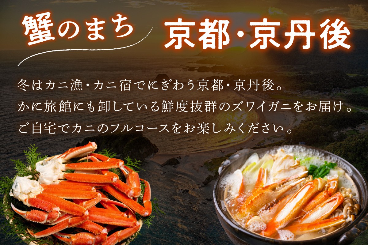 新鮮な生のズワイ蟹を当店の目利きのプロが数ある仕入先から身入り・鮮度を厳選して、職人が1本ずつ丁寧にカットしてお届けいたします。 鮮度抜群なのでお刺身でも食べられる当店のカニは、とろける甘み、ねっとりとした食感で満足間違いなし! またかには鮮度が命ですので鮮度の良いずわいがにを丁寧に素早く加工し、鮮度を保つため、氷の膜で覆うことで生でも食べられる鮮度を維持し、お客様が安心してかに料理をお楽しみいただける商品を提供いたします。 是非この機会に京丹後の旅館でも使用されているずわい蟹を大切なご家族、ご友人とご賞味ください。 ◆有限会社 海祥(〒629-3441 京都府京丹後市久美浜町神崎48-8) 鮮度、品質自慢のかに大将です!! 京丹後から全国の寄付者の皆様に安全安心の高品質な商品開発をお届けしたい!そのような想いで、新鮮な魚介類等を地域の皆様、観光客の皆様、そして全国の皆様にお届けしています。 【注意事項】 ・画像はイメージです。 ・生状態のズワイガニは、解凍後の時間の経過によって酸化すると色が黒く変色します(黒変)。黒変しても食べられますが、より美味しくお召し上がりいただくためには、召し上がる直前に解凍し、中心部分が半解凍の状態で料理を開始することをお勧めいたします。 ・配送日の指定は承れません。 ・事前連絡をいただいていないご転居・ご不在等や、寄附者様のご都合で返礼品をお受け取りいただけなかった場合、返金及び返礼品の再送は致しません。