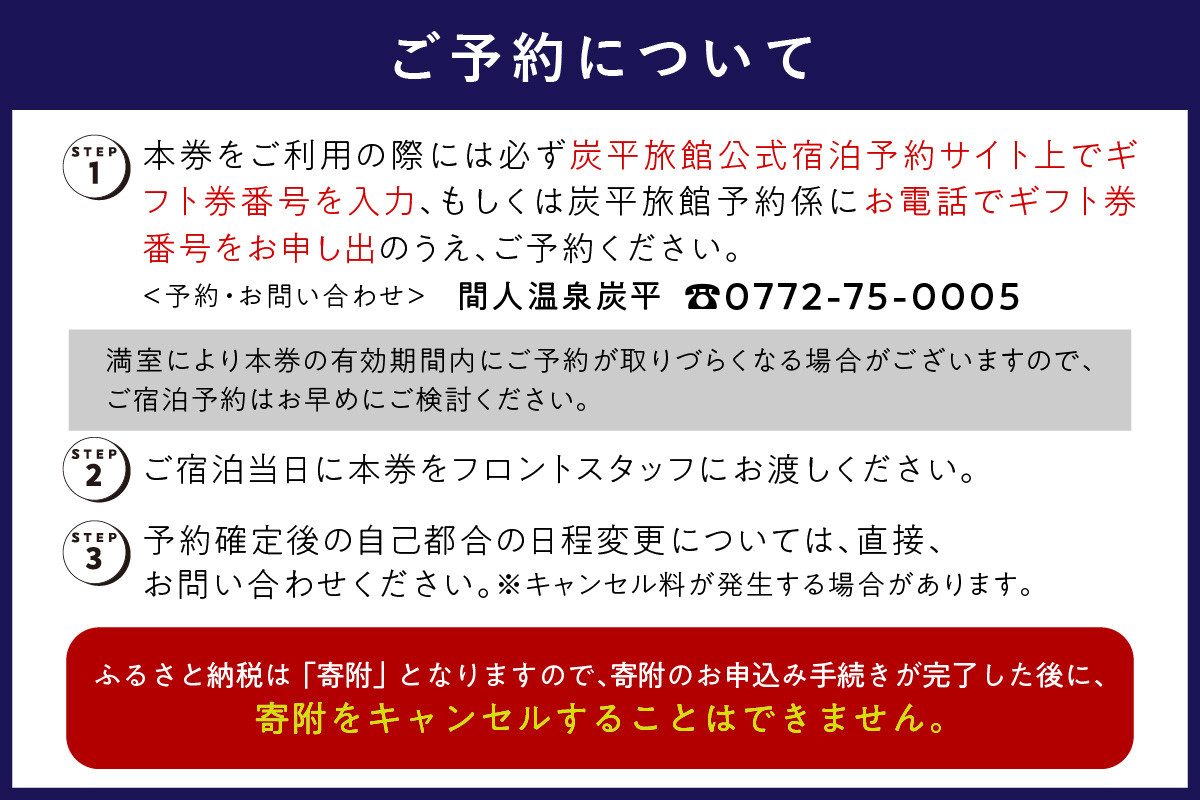 間人温泉炭平のご宿泊代として利用可能な宿泊クーポンです。 当館は、 明治元年より京都最北の地、自然に囲まれた静かな漁村、間人蟹で知られる京都府丹後間人(たいざ)にございます。目前に広がる日本海の豊かな光景と、百五十有余年受け継がれた漁師町料理と、まごころのおもてなしでお客様をお迎えいたします。 ≪ご予約について≫ ○本券をご利用の際には必ず炭平旅館公式宿泊予約サイト上でギフト券番号を入力、もしくは炭平旅館予約係にお電話でギフト券番号をお申し出のうえ、ご予約いただき、ご宿泊当日に本券をフロントスタッフにお渡しください。 ○満室により本券の有効期間内にご予約が取りづらくなる場合がございますので、ご宿泊予約はお早めにご検討ください。 ○予約確定後の自己都合の日程変更については、直接、お問い合わせください(キャンセル料が発生する場合があります)。 ○宿の公式サイトで販売される割引きプラン等との併用が可能です。 ○宿の公式サイトで販売される観光支援策や各種割引きキャンペーンとの併用が可能です。 ○各種キャンペーン等の割引との併用は、併用先のキャンペーン等が併用不可の場合を除き利用できます。 【予約・お問い合わせ】間人温泉炭平 TEL: 0772-75-0005 【注意事項】 ≪2024年10月1日以降のお申込について≫ ふるさと納税制度改正により、当館でのクーポン券等のご利用は、お1人1泊あたり50,000円分までとなりますのでご注意ください。 ※2024年9月30日までに寄附完了された場合は、ご利用額に制限はありません。 ※複数種類のクーポン等を組み合わせる場合でも、ご利用いただける上限額はお1人1泊あたり50,000円分までとなります。 ご利用の例: 宿泊料金120,000円の部屋に2人で泊まる(1泊)場合 ふるさと納税の宿泊クーポン等が利用できるのは、100,000円分まで(50,000円分×2人)