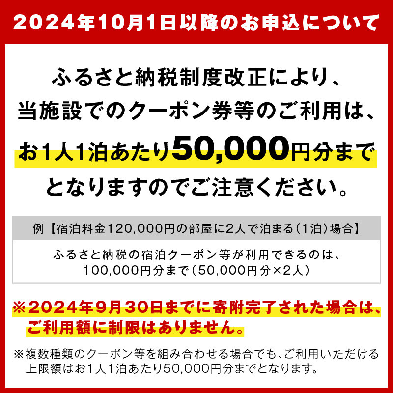 ふるさと納税制度改正により、当館でのクーポン券等のご利用は、お1人1泊あたり50,000円分までとなりますのでご注意ください。