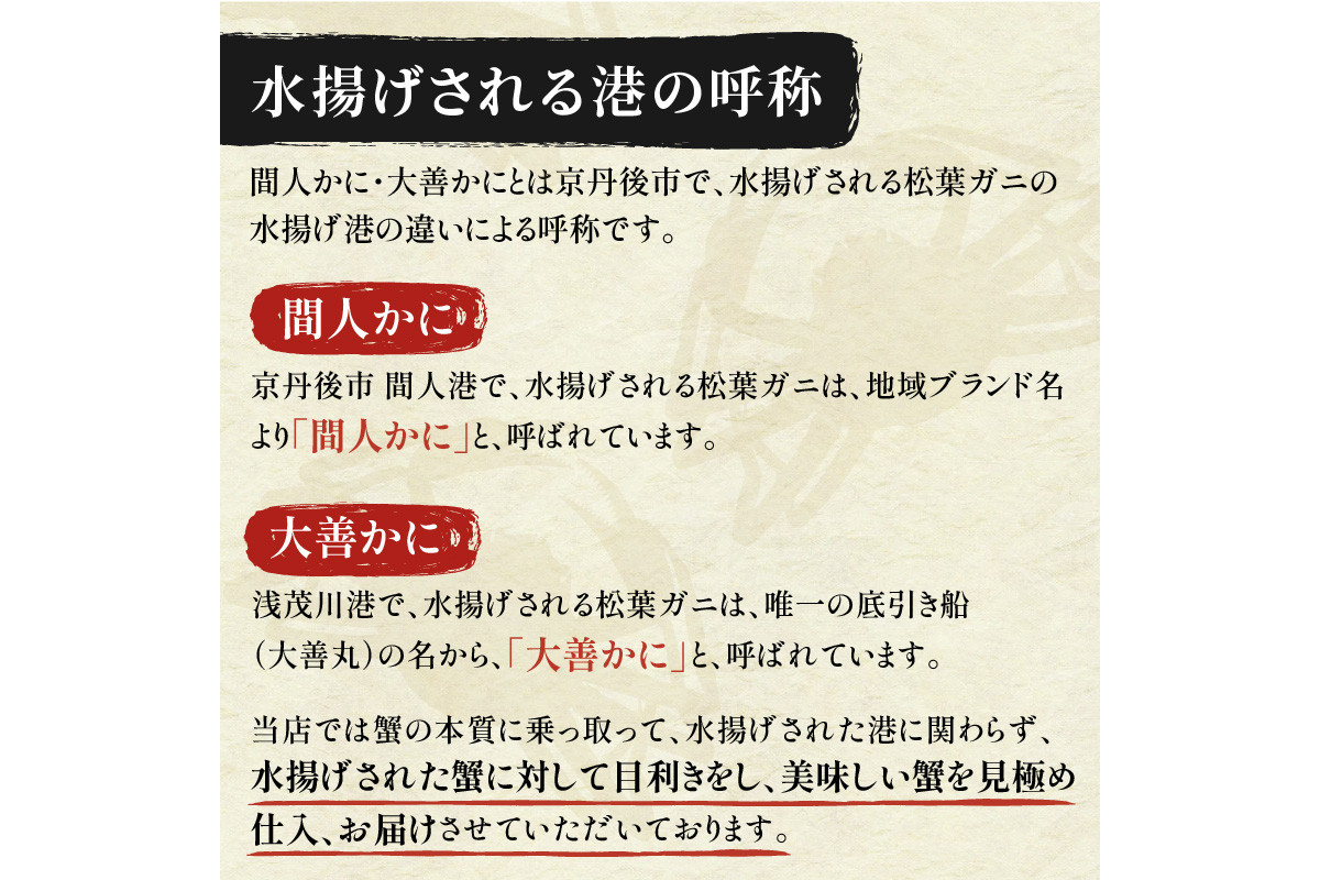 間人ガニ大善ガニと呼ばれる 京丹後市で水揚げされた緑色のタグ付き松葉ガニを 魚政独自の製法で、ボイルして、絶妙な味に仕上げ、未冷凍でお届けします。 さばいてそのままの蟹の味をご賞味ください。甘く繊細でジューシーなカニ身と、 濃厚なカニ味噌が魅力なので、カニ味噌にカニ身を絡ませながら食べていただくと、 より一層美味しくお召し上がりいただけます。 間人ガニ・大善ガニとは京丹後市で、水揚げされる松葉ガニの水揚げ港の違いによる呼称です。 京丹後市は、合計6隻の底引き網船。間人港 5隻。市町村合併前に名付けられた地域ブランド名より 「間人ガニ」。 網野浅茂川港は、1隻。船(大善丸)の名から、「大善ガニ」と、呼ばれています。 ※天候、水揚げの状況により、長らくお待ちいただく場合も御座います。 ※お礼品名のグラムについては、茹でる前の重さです。茹でると15%程度目減りします。 加工業者:株式会社魚政 【注意事項】 お届け日時についてのお知らせとお願い 京丹後市では 間人港(間人ガニ)5隻、網野浅茂川港(大善ガニ)1隻、合計6隻操業していますが、 20t未満の小型船籍の為、少しの時化(しけ)でも操業が出来ない為、水揚げも少なく限られた数でのお届けになります。 早々にご注文いただいても、長らくお待ちいただく事も御座います。 出来る限り早い目に手配させていただきますが、予めご了解の上、お申し込み下さい。 【その他注意事項】 ・画像はイメージです。 ・事前連絡をいただいていないご転居・ご不在等や、寄附者様のご都合で返礼品をお受け取りいただけなかった場合、返金及び返礼品の再送は致しません。