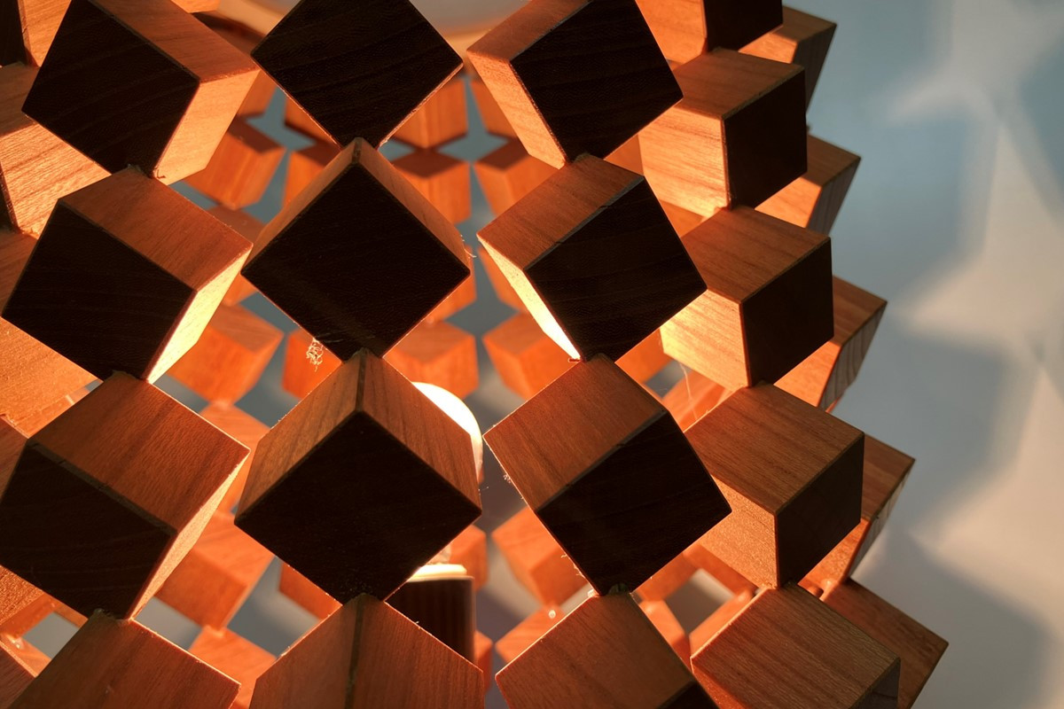 小さな木の立方体を対角線上に積み重ねることで、和柄の「賽の目」を立体的に表現した灯りです。「賽の目」から木漏れる光と影は市松模様の花となり、日々の生活に彩りを添えてくれます。灯りは照度を得るためだけの道具ではなく、生活に安らぎと華やぎをあたえてくれるものであってほしい。