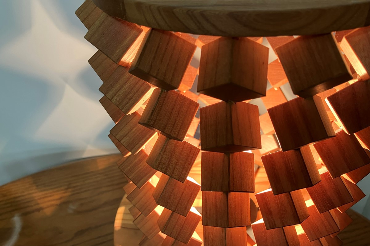 木製のセードは暖かみのあるケヤキ材の手触りと色艶を大切にし、一枚の無垢材から切り出された立方体を、ひとつひとつ木目の方向をそろえながら積み重ねて作られています。そのシンプルな構造とデザインはどんなスタイルのインテリアにも調和し、灯りとして様々なシーンを演出するのはもちろんのこと、ものそのものとしての存在感もお楽しみいただけます。