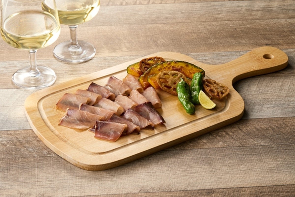 日本三大鰤(ブリ)漁場である、京都府伊根町の寒ブリを使用。天然物に負けない養殖の伊根ブリは、身が引き締まり、脂ノリもほどよく、あっさりと美味しいのが特徴。身質が良く、天然ブリよりも高い評価を得ています。そんな伊根ブリを使用した「ブリの生ハム」は天然塩(琴引きの塩)のみで熟成させ、もちっと&しっとり食感がクセになります!