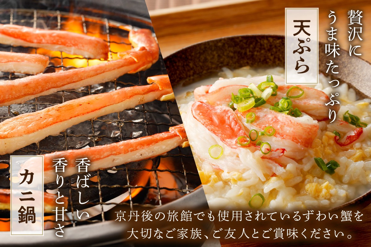 新鮮な生のズワイ蟹を当店の目利きのプロが数ある仕入先から身入り・鮮度を厳選して、職人が1本ずつ丁寧にカットしてお届けいたします。 鮮度抜群なのでお刺身でも食べられる当店のカニは、とろける甘み、ねっとりとした食感で満足間違いなし! またかには鮮度が命ですので鮮度の良いずわいがにを丁寧に素早く加工し、鮮度を保つため、氷の膜で覆うことで生でも食べられる鮮度を維持し、お客様が安心してかに料理をお楽しみいただける商品を提供いたします。 是非この機会に京丹後の旅館でも使用されているずわい蟹を大切なご家族、ご友人とご賞味ください。 ◆有限会社 海祥(〒629-3441 京都府京丹後市久美浜町神崎48-8) 鮮度、品質自慢のかに大将です!! 京丹後から全国の寄付者の皆様に安全安心の高品質な商品開発をお届けしたい!そのような想いで、新鮮な魚介類等を地域の皆様、観光客の皆様、そして全国の皆様にお届けしています。 【注意事項】 ・画像はイメージです。 ・生状態のズワイガニは、解凍後の時間の経過によって酸化すると色が黒く変色します(黒変)。黒変しても食べられますが、より美味しくお召し上がりいただくためには、召し上がる直前に解凍し、中心部分が半解凍の状態で料理を開始することをお勧めいたします。 ・配送日の指定は承れません。 ・事前連絡をいただいていないご転居・ご不在等や、寄附者様のご都合で返礼品をお受け取りいただけなかった場合、返金及び返礼品の再送は致しません。