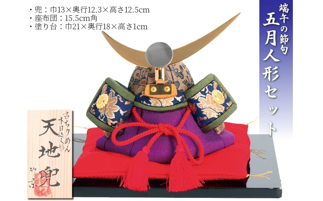 京丹後市内の生産者による手作業で作られた帯地や古布を用いた木目込み(きめこみ)の兜。時を重ねた布の風合いが、静かな力強さと気品を纏わせます。伝統の技と素材が響き合う、格調高い節句飾りです。天地兜には、「天」と「地」両方の守りを受け、健やかに、そして力強く成長して欲しいという願いが込められています。お子さまの初節句のお祝いはもちろん、お孫さまへの贈りものや、ご家族の大切な節目を彩る返礼品としてもおすすめです。