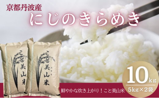 こと美山のブランドであること美山米は、なんといっても甘味が特徴です!中山間地域特有の寒暖差と採水地と用いられるほどの綺麗な水を惜しみなく使用することで美山地域でしか作れない美味しいお米を作っています。 【にじのきらめきについて】 もっちりとした食感で粘り強く、甘味が強いお米になります。 また粒が大きいため、炊き上がりの艶が際立つのも特徴です。 少しのおかずでおにぎりにしていただけると、お米の甘味がより際立ち美味しく食べていただけます! また、注文を受けてから精米を行うことでお米が持つ香りと甘味を最大限閉じ込めたまま出荷しております。 ぜひこだわりのこと美山米をお楽しみください! ※本返礼品は南丹市にて生産されています。 ※画像はイメージです。 ※お届けは2026年1月以降となります。