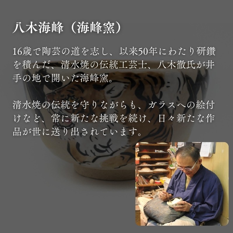 16歳で陶芸の道を志し、以来50年にわたり研鑚を積んだ清水焼の伝統工芸士、八木徹氏が井手の地で開いた海峰窯。その海峰窯の熟練した職人は、清水焼の伝統を守りながらも、ガラスへの絵付けなど、常に新たな挑戦を続け、日々新たな作品が世に送り出されています。