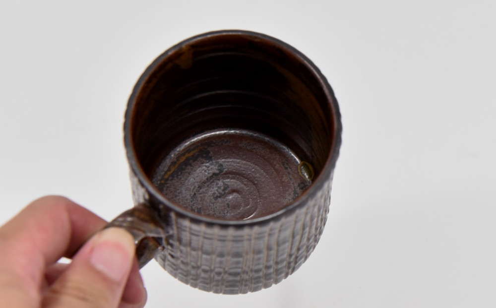 新羅釉(しらぎゆう)という朝陽窯オリジナル釉の黒い顔料の京焼のマグカップです。1つずつ手彫りした木賊紋(とくさもん)様をあしらっています。日常の中で親しみながら独創の存在感を放つ一品です。電子レンジ、食器洗機に入れて頂いてもOKです。