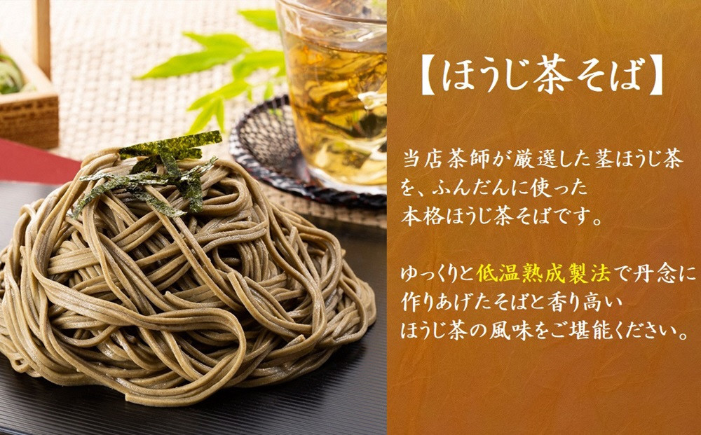 上質な宇治抹茶をふんだんに使った本格抹茶そばと、茎ほうじ茶を使用した香り高いほうじ茶そばのセット。低温庫内で2昼夜もの時間をかけた低温熟成製法で丹念に作りあげ、つるっとした食感と香り高い抹茶の風味が自慢のお蕎麦です。宇治のお茶屋が手掛けるこだわりの茶蕎麦をぜひご賞味ください。