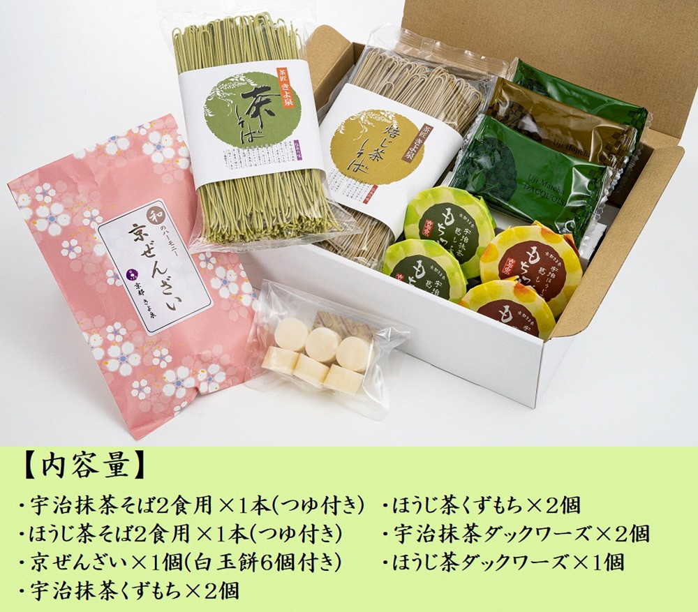 | 容量 | ●宇治抹茶そば(160g/2食用)×1袋入り・ほうじ茶そば(160g/2食用)×1袋入り、つゆ(22ml)×4食分付き ●宇治抹茶くずもち(77g)×2個、ほうじ茶くずもち(77g)×2個 ●宇治抹茶ダックワーズ(25g)×2個 、ほうじ茶ダックワーズ(25g)×1個 ●京ぜんざい×1袋 (180g / 1食分)、白玉1パック(6個入り) |