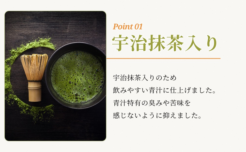 緑茶発祥の地である宇治田原町産の高級抹茶をふんだんに使用。くせの少ない大麦若葉に当店二代目茶師が高級抹茶と緑茶粉末を絶妙にブレント。抹茶と緑茶粉末をブレンドしていることから青汁独特の臭みや苦みを抑えており、まるで緑茶のような味わいに。日本茶の名産地『宇治田原町』の自然豊かな環境で育てられた高品質な茶葉を使用し、抹茶のまろやかな甘みと緑茶の爽やかさを兼ね備えた一品です。野菜不足や栄養不足が気になる方は特におすすめ。毎日の「健康」「栄養」と毎日飲みたくなるような味わいに仕上げました。個包装スティックタイプで日々の生活に手軽に取り入れる事が出来ます。水やお湯にさっと溶かすだけで、抹茶のコクと緑茶の清涼感が楽しめる、青汁が苦手な方でも抵抗なくお飲みいただけるスッキリとした味わいが特徴です。また持ち運びにも便利。外出先でもお手軽にお飲みいただけます。