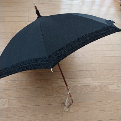 展示会での企画から誕生した日傘です。すべてのパーツが日本で作られています。株式会社大江が手掛けた生地は撥水加工が施され、梨の皮のような細かい凹凸感のあるシボを出した織物「梨地」となっています。飾りに使われているトーションレースは、織物の製造過程で出てしまう残糸を使い、レース専門会社とのコラボで繊細に編み、100%シルクレースを実現しました。持ち手も木製で見た目に美しく、握った際の手触りもしっとりと馴染みます。ワンポイントで房がついています。TPOを問わないシックなブラックで冠婚葬祭にもお使いいただけます。