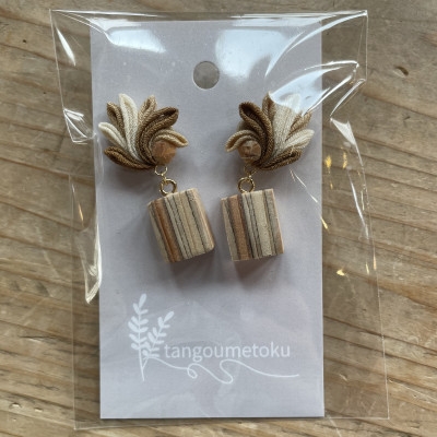 日本最大級のシルク織物の産地で織物事業者からしか手に入らない精錬前のシルクを使用して、ひとつひとつ職人が手作りした「つまみ細工」と、与謝野町産の天然木(ヒノキまたはスギ)を加工した手づくりのピアスです。