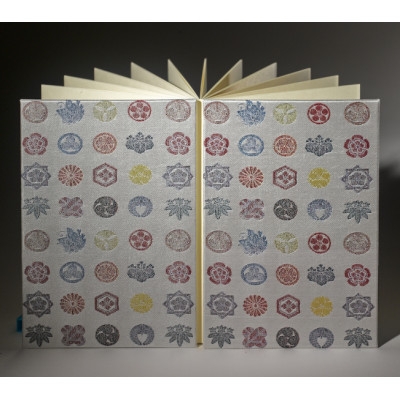 こちらの御朱印帳は、赤・青・黄・黒など多彩な色使いで、華やかに家紋をあしらった一冊。