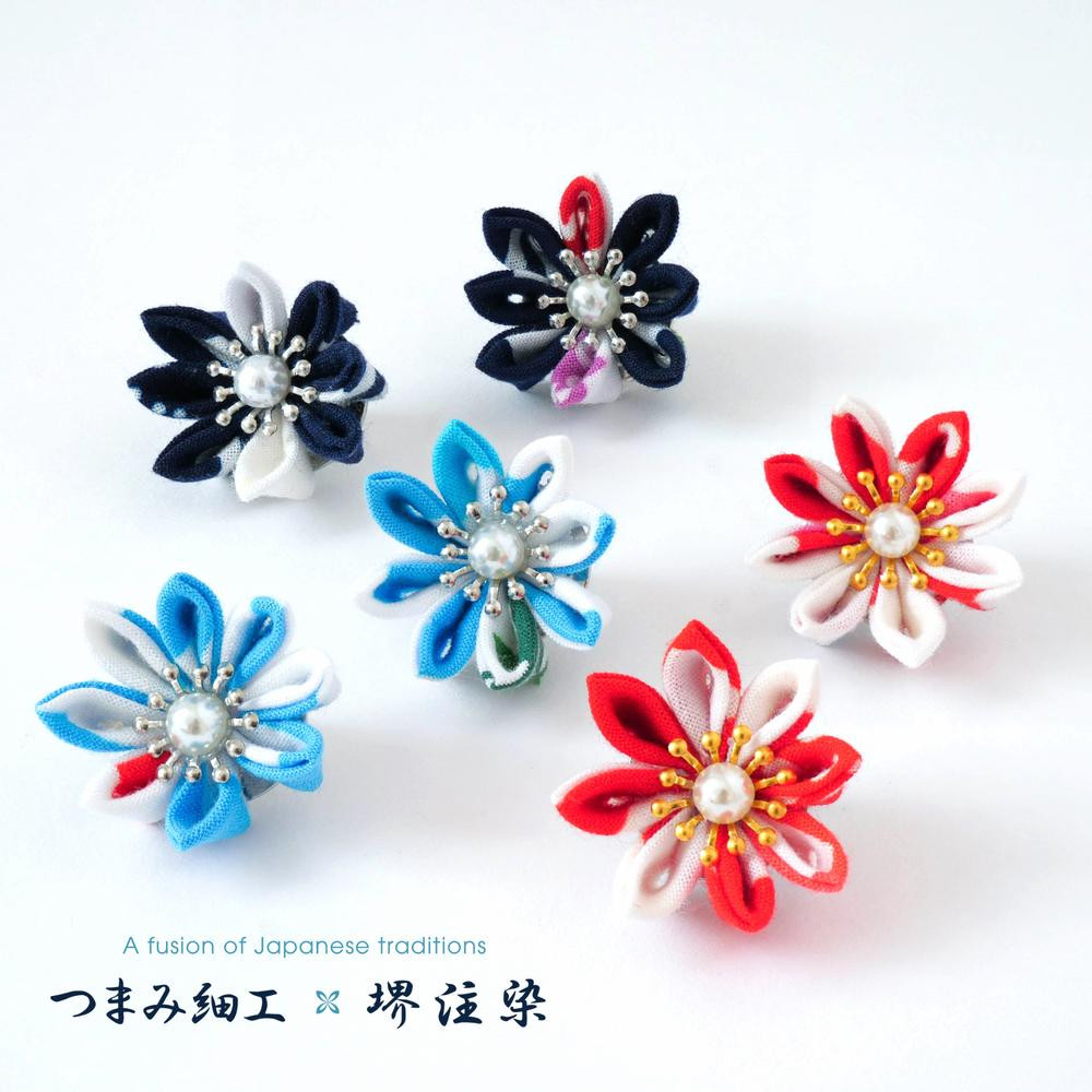 【堺の伝統工芸・サステナブルに貢献】本来なら子供の浴衣になる予定の伝統工芸注染染め。規格外だからと廃棄をするのではなく新たな命を吹き込みました。浴衣で「舞う」にちなんで花舞うイヤリングと名付けました。伝統のつまみ細工技法でひとつひとつが手作りです。それぞれ模様の出方や色が違うあなただけのイヤリング