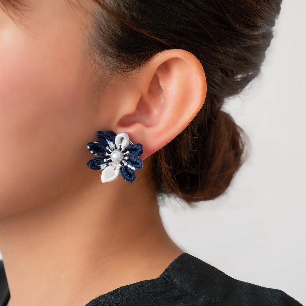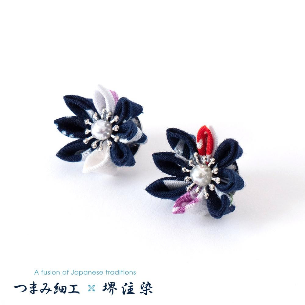 花舞うイヤリング「つまみ細工×堺注染」(紺)