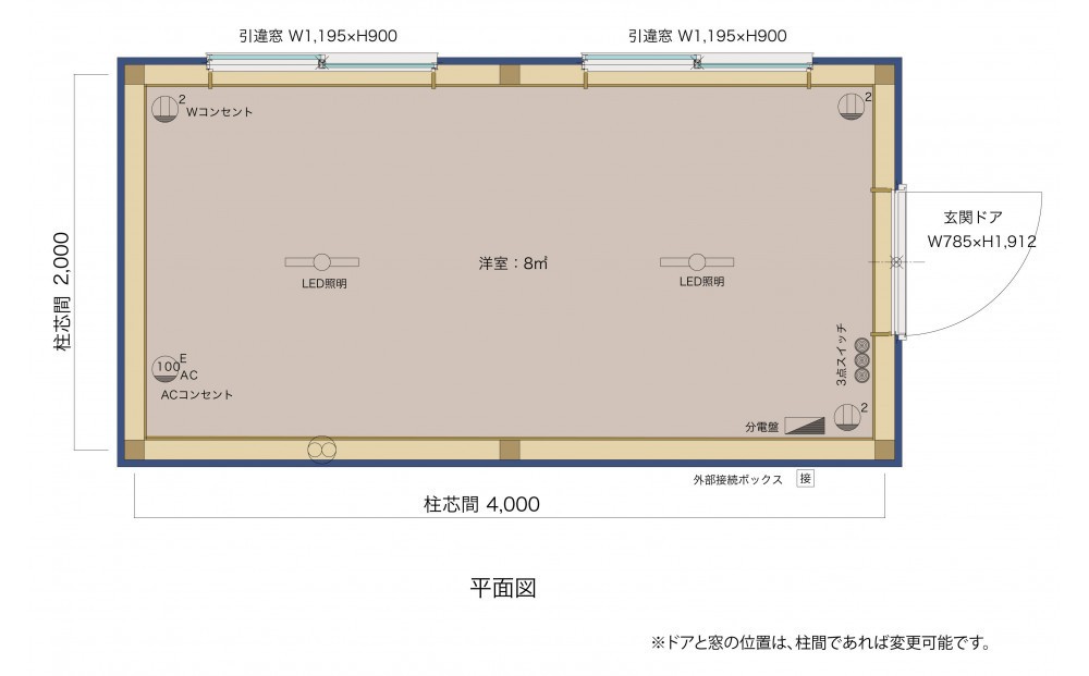 | 容量 | 【提供サービス】 本格「木造建物」で吊って置くだけのユニットハウスです。 ・柱芯W2,000×4,000×軒高2,600(外寸W2,166mm×L4,166×H2,600)、重量約1.3t ・構造体:土台ヒノキKD、柱スギKD、床24mm構造用合板、外壁・屋根下地合板、特殊接合金物 ・屋根材:ガルバリウム鋼板 ・外壁材:窯業系サイディングt=14 ・内壁:羽目板仕上げ、天井:石膏ボード ・床仕上げ:タイルカーペット ・Wコンセント3箇所、スイッチ1箇所、LED照明2箇所、パイプファン1箇所、分電盤 ・断熱材(床・壁・天井) ・鋼製建具:ドアW785×H1,900(1箇所)、引違窓W1,200×H900(2箇所) ・輸送、設置 【ご注意事項】 ・建築物扱いとなり、地域や設置場所等によって条件が異なりますので、ご設置予定場所や進入路などをご確認の上、ご寄付(ご注文)前に株式会社ビスダックジャパンへご相談下さい。 ・仕様や設置日等のお打合せが必要になりますので、直接のご連絡手段が必要となります。 ・配送と設置に際しては、日時・場所等を含めて、事前のお打ち合わせが必要になります。なお、土日祝を除く平日の配送・設置となります。 ・クレーン付き4tトラックで完成品を輸送し、クレーンを設置場所に横づけして設置します。そのため、トラックの搬入路・現場での横づけスペース、クレーンの可動範囲分のスペースが必要となります。 ・ご希望の仕様によっては金額が変わる場合がございます。 【その他ご注意事項】 ・提供サービスは、本体、本体輸送と設置です。 ・基礎工事や土間工事、空調工事、電気・給排水の一次引き込み工事、建築確認申請等は承っておりません。 ・画像はイメージです。 ・全て無垢材を使用していますので、キズ、欠け、割れ、節が発生します。予めご了承ください。 ・色見本と実際の仕上がりの差異等につきましてのクレームやキャンセルはお受けできません。 ・雨漏り保証期間は設置後から10年間となります。 ・沖縄県・離島・北海道へのお届けはできません。 ・高額品となりますので、お問合せいただきお品のご説明と打ち合わせの上、お申込み下さい。 ・ご注文(ご寄付)確定後に製作を始めますので、納品には1.5か月~の期間を頂いております。なお、受注生産品のため、ご注文(ご寄付)後のキャンセルはできません。 |