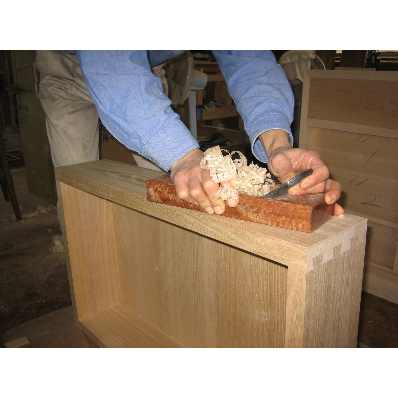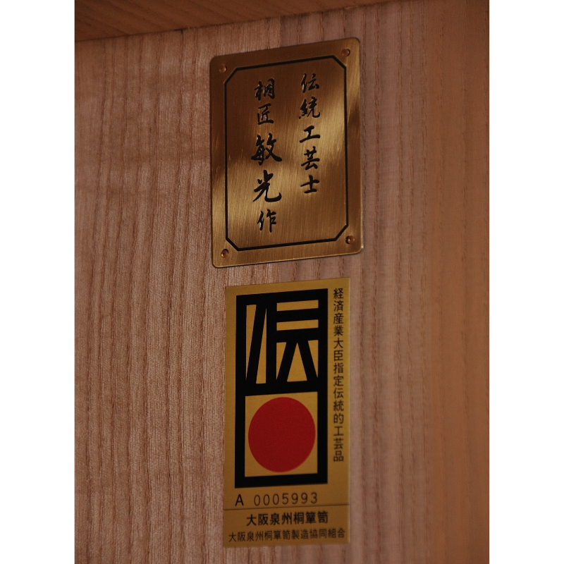 タンス本体は全て蟻組み(ありぐみ)または臍組み(ほぞぐみ)により堅牢に組上げられ、底板裏板に至るまですべて厳選された良質な桐材を使用し、大阪泉州桐箪笥伝統工芸士の資格を持つ職人が一棹一棹丁寧に造り上げています。