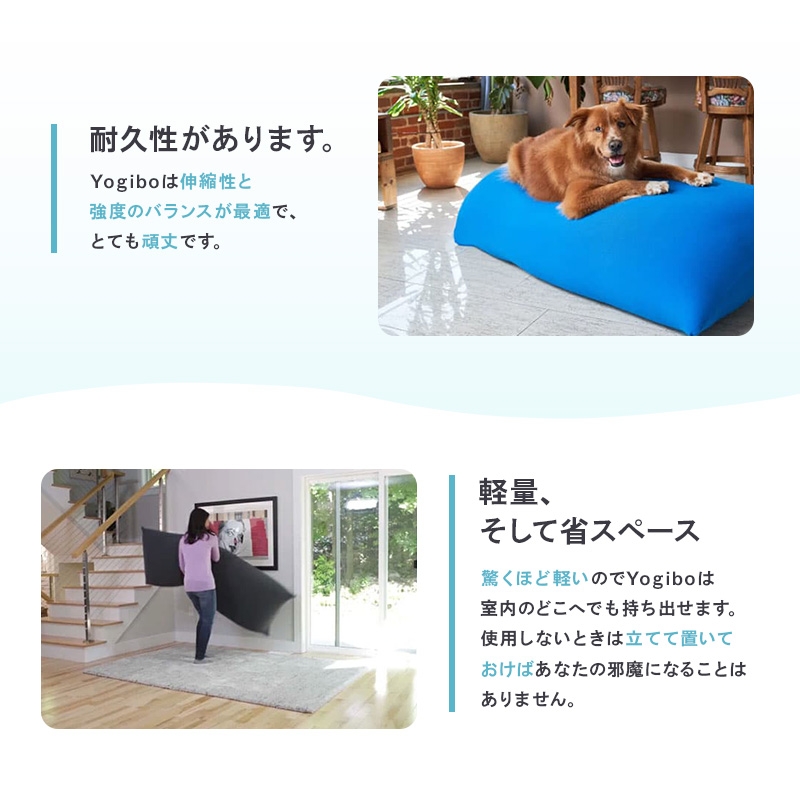 ※新品のYogiboは、新しいビーズ特有の科学的なにおいがすることがありますが、人体に害のあるもの ではございません。通常、数日~1ヶ月ほどでにおいはなくなりますが、においが 気になる場合は風通しの良い場所にしばらく置いてください。