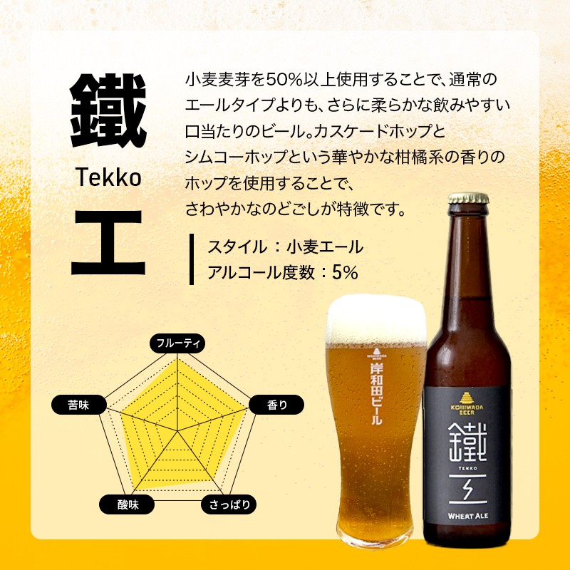 毎月発送の定期便です。 ■ビールの詳細 【鐵工】 小麦麦芽を50%以上使用することで、通常のエールタイプよりもさらに柔らかな飲みやすい口当たりのビールに仕上げました。華やかな香りがする柑橘系のホップを使用しているため、爽やかなのどごしを堪能することができます。 2024年受賞しました。 ジャパングレートビアアワーズ2024・・・酵母入りアメリカンウィートエール部門 銅賞受賞 ・スタイル:小麦エール ・アルコール度数:5% 【黒鐡】 ローストモルトとカラメルモルトをブレンドした麦芽の香ばしい風味とコクのある味わいが特徴の黒ビール。黒ビールが初めての方や苦手な方にも飲みやすいおすすめの味わいです。 2024年2冠達成しました。 ジャパングレートビアアワーズ2024・・・ブラウン・ポーター部門 金賞受賞 インターナショナルビアカップ2024・・・カテゴリチャンピオン 受賞 ブラウン・ポーター部門 金賞受賞 ・スタイル:ブラウンポーター ・アルコール度数:5% 【白鐡】 とても軽やかなのどごしで岸和田ビールの商品の中でもダントツの飲みやすさを誇るビール。 ホップの香りが苦手でビールが得意でない方でも何杯もおかわりしたくなるような味わいが特徴です。 ・スタイル:ライトエール ・アルコール度数:5% ■生産者の声 私たち北海鉄工所は、鉄やステンレスなど金属製のタンクに使用される【鏡板】と呼ばれる部品を岸和田の地で製造しています。 岸和田ビールは、この金属加工技術を生かした自社設計・自社製造の設備を用いて醸造いたしました。