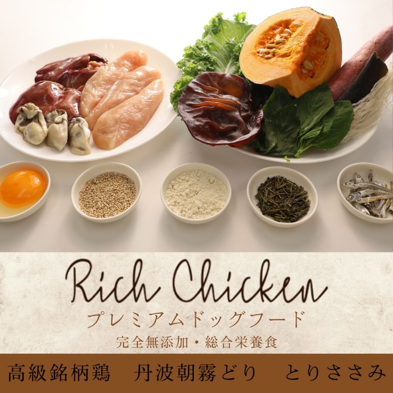 原材料:丹波朝霧どりささみ肉:55.8%:兵庫県産、丹波朝霧どりレバー:10.9%:兵庫県産、かぼちゃ:7.8%:北海道産・沖縄産、さつまいも:7.8%:徳島県産、鶏卵:6.2%:国内産、牡蠣:3.1%:広島県産、煮干し:2%:愛媛県、おから:1.5%:徳島県、寒天:0.8%:岐阜県産、ケール:0.8%:九州産、モロヘイヤ:0.8%:島根県産、きくらげ:0.8%:和歌山県産、ごま:0.8%:国内産、鶏卵殻:0.7%:国内産、茶:0.2%:国内産、昆布:0.02%:北海道産