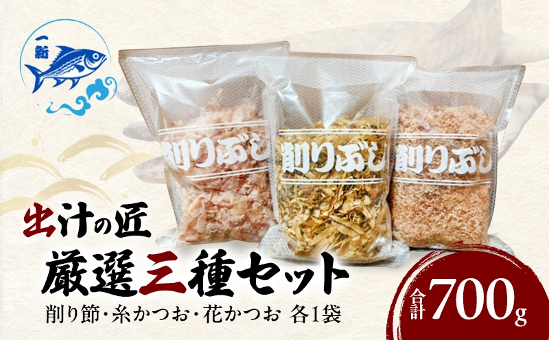 出汁の匠 厳選三種セット(削り節・糸かつお・花かつお)各1袋 合計700g / 大阪府岸和田市 鰹節 かつお節 かつおぶし 鰹 加工品 だし みそ汁 魚介類 海鮮 [№5385-1091]