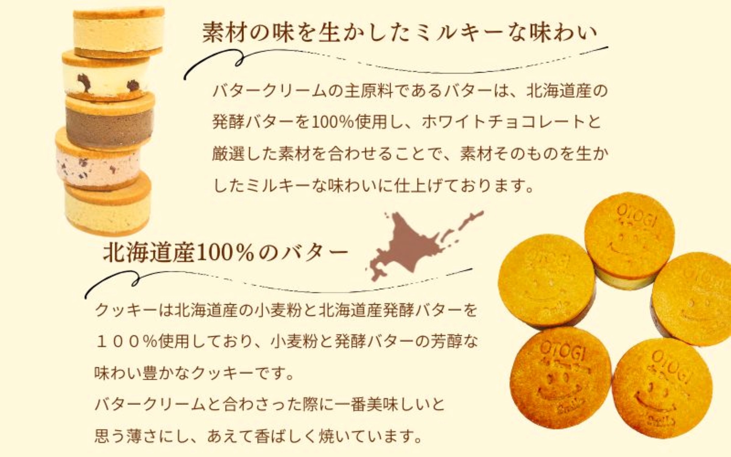 【バターサンドのクッキー】は、北海道産の小麦粉と北海道産発酵バターを100%使用しており、小麦粉と発酵バターの芳醇な、味わい豊かなクッキーです。バタークリームと合わさった際に一番美味しいと思う薄さにし、あえて香ばしく焼いております。