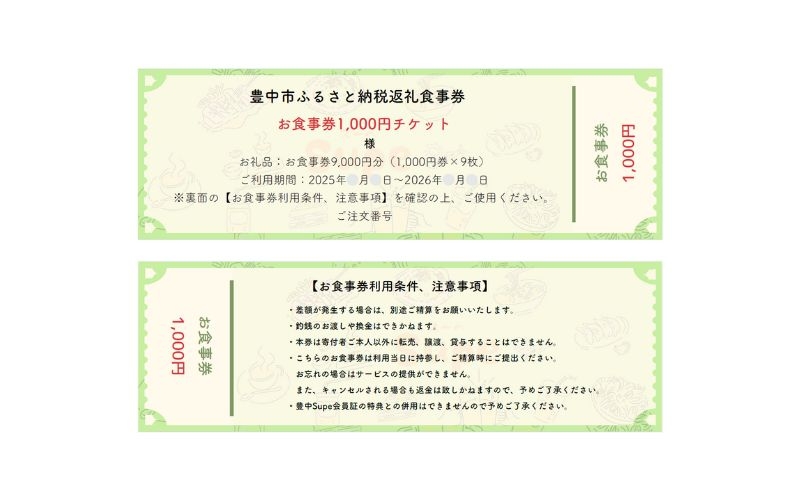 この自治体のポイントについてチョイス公式ポイント交換対象 該当飲食店で使える飲食チケット! 複数店舗での使い分けもOK! 豊中飲食チケット! 9,000円分(1,000円券×9枚)