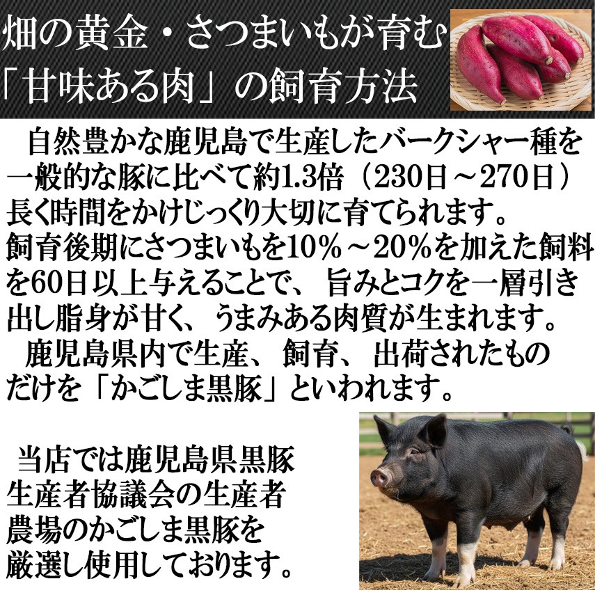 かごしま黒豚は自然豊かな薩摩の地で、じっくり丹精込めて育てられます。肥育後期に「畑の黄金」さつまいもを与え、その肉質は格別に。