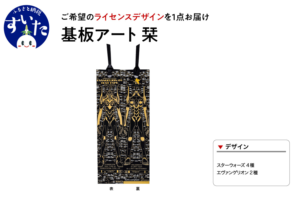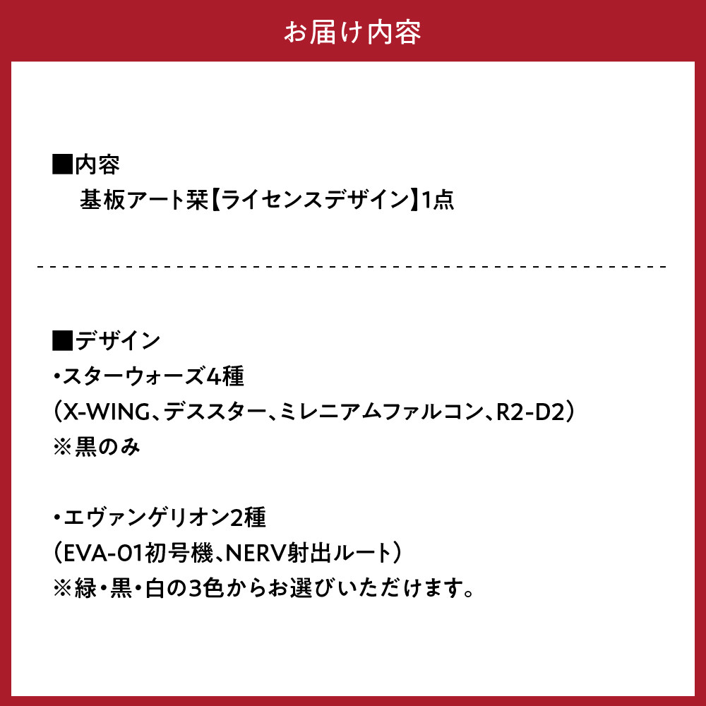 | 容量 | 基板アート栞(ライセンスデザイン):1点 (サイズ:140mm×32mm×0.45mm、重さ:3g) 【デザイン】 ◆スターウォーズ4種(X-WING、デススター、ミレニアムファルコン、R2-D2) ※黒のみ ◆エヴァンゲリオン2種(EVA-01初号機、NERV射出ルート) ※3色(緑・黒・白)からお選びいただけます。 |