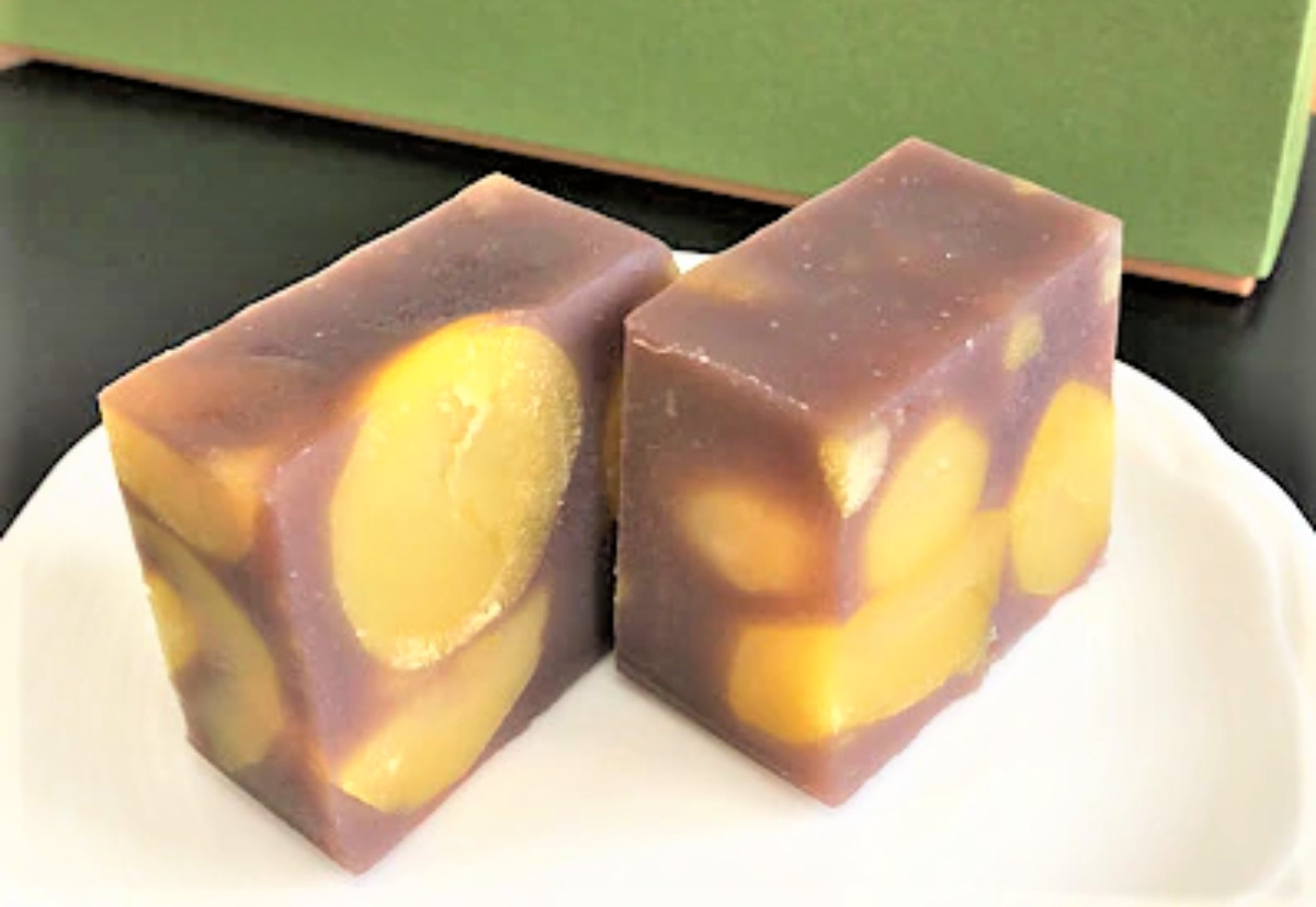 栗蒸し羊羹:小豆・栗・砂糖・小麦粉・うき粉・葛粉・くちなし色素