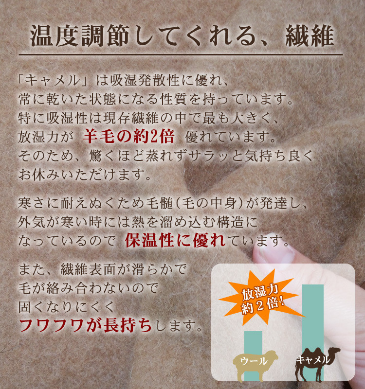 安心の日本製で、安心の天然素材、キャメル100%(毛羽部分)を使いました。 天然素材の恵みが、こころとからだに響きます。 厳しい自然が生んだ、天然素材、キャメルの生産量は羊毛のわずか0.14%程度です。 極めて希少な繊維、ふたこぶラクダの毛を100%使用した贅沢な逸品です。 夏の気温45度に達し冬はマイナス30度まで下がる厳しい自然環境の中国・モンゴル地区に生息するふたこぶラクダ。 このラクダから取れるうぶ毛は良質で、極めて細く、長く軽くふわふわした感触です。 ふたこぶラクダが厳しい環境の中で生き抜くために必要不可欠な天然繊維は、私たち人間にもほっとする暖かさと安らぎを与えてくれます。 ■生産者の声 温度調整をしてくれる、キャメル繊維です。 「キャメル」は吸湿発散性に優れ、常に乾いた状態になる性質を持っています。 特に吸湿性は現存繊維の中でも最も大きく、放湿力が羊毛の約2倍と優れています。 そのため、驚くほど蒸れずさらっと気持ちが良くお休みいただけます。 寒さに耐え抜くため毛髄(毛の中身)が発達し外気が寒いときには熱を溜め込む構造になっているので保温性に優れています。 また、繊維の表面がなめらかで毛が絡み合わないので固くなりにくくふわふわが長持ちします。 清潔を保つ天然素材のキャメルの毛は油分が含まれているため、防水性があり汚れが付きにくいので、清潔にご使用いただけます。 ウールには生命を守るための免疫機能が備わっており、キャメルも同様だと考えられています。 天然素材の力を皆様にもっと知っていただきたい、そんな思いから「本当に良い素材」で作られた反物を厳選して仕入れ、日本一の毛布の産地、泉大津で熟練した職人さんが丹念に縫製してもらいました。 心地よい眠りへの思いをギュッと詰め込んだこの毛布の優しい温かさを体感してみてください。 ※画像はイメージです。 【大津毛織株式会社】