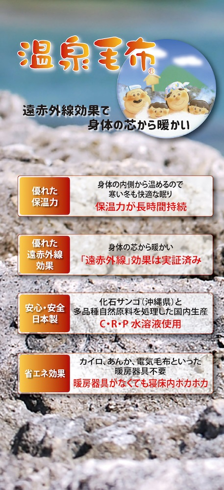 沖縄県産の天然サンゴの化石を主原料とし、その他の自然原料とともにミネラル成分を抽出した水溶液を、毛布に特殊吸着加工したものです。