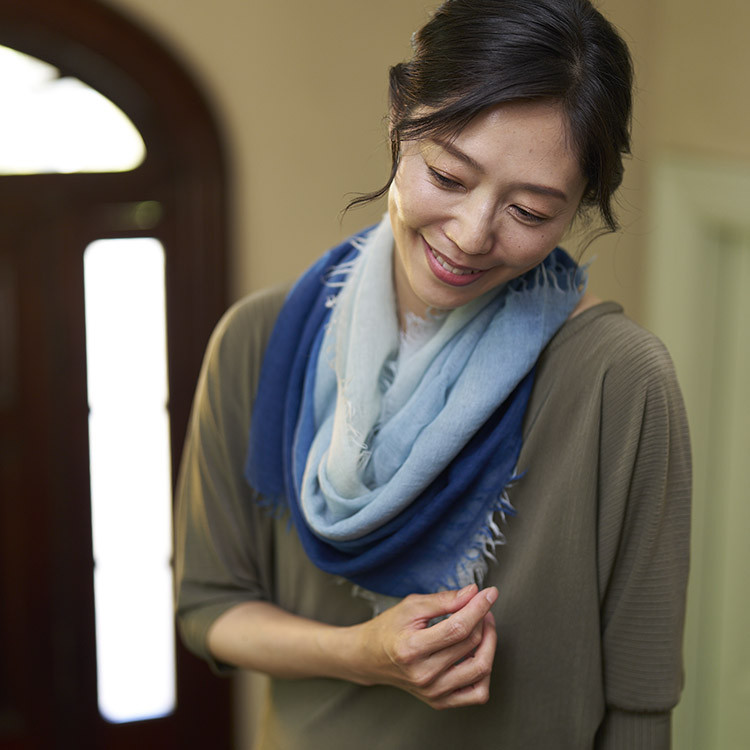 「巻くと幸せな気分になれる」そんなストールです。 一枚のストールに使用されている極細のカシミヤうぶ毛をつなぎ合わせると、その長さはなんと300キロメートル! ロンドン→パリの直遠距離とほぼ同じです。 それだけタップリのうぶ毛を使いながらも、ストール1枚はピーマン1個分のわずか50gくらいと驚きの軽さ。 一日中巻いていても、まったく肩が凝るようなこともなく、身体の一部になったかのような一体感を味わっていただけます。 ご家庭で水洗い(手洗い)もしていただけます。 湿気の多い時期は、巻いていただくと首回りの湿気を吸ってくれるので、サラッと心地よいです。 多少汗ばんだりしても、手洗いしていただけば常に清潔にお使いいただけます。 一年を通して、毎日のようにお使いください。 ドンドン使って、ドンドン手洗いしていくと、ドンドン風合いも良くなって参ります。 【注意事項/その他】 ※藍染めの特性上、最初のうちは色移りの恐れがございますので、白いシャツなどと合わせるのは避けてください。 何度か水洗いしていただくうちに、徐々に色が落ち着いて参ります。 お礼品に同封の「登録はがき」にて寄付者様ご自身で会員登録をしていただきましたら下記の対応をいたします。 ・引っ掛けキズなど、無料でお修理、水洗い・毛玉除去・アイロンがけなど、無料でメンテナンスいたします。 ※修理の際は、寄付者様から細川毛織へ宅配便でお品物をお送りください。 (お送りいただく際の送料は寄付者様負担となりますが、修理完了後の送料は無料となります) ※到着したお品物は、職人が一枚一枚丁寧に修理やメンテナンスを行います。 ※修理やメンテナンスの受付期間や回数制限はございません。 【お手入れ方法】 こまめに水洗い(手洗い)してください。 洗面器に水道水(常温)を入れ、その中で軽く押し洗い。 通常、汗などはお水だけできれいに取れます。 ※お化粧品や食べ物の汚れがついた場合は、衣料用中性洗剤(オシャレ着洗い)を適量入れてください。 すすぎ後は、軽く手で水分を切り、日陰に干してください。 【細川毛織株式会社】