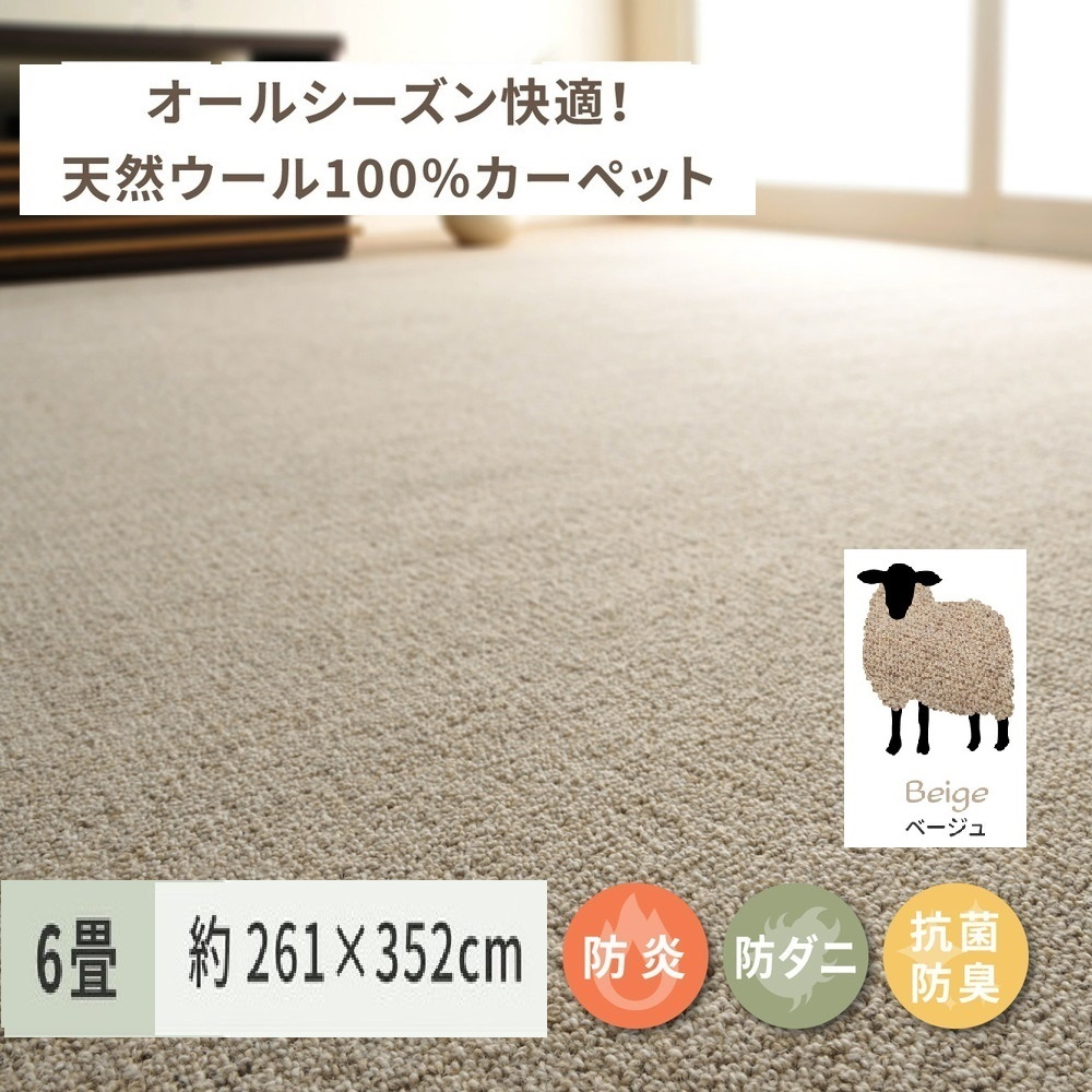 天然ウール100%の 防炎 カーペット 1枚 6帖 ベージュ 約261×352…