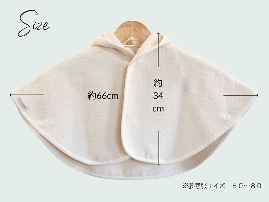 | 容量 | ■製品サイズ:裾幅(約)66cm、裄丈(約)34cm ■製造地:大阪府泉大津市 ■原材料/成分 よこ糸(毛羽部分):GOTS(オーガニックテキスタイル世界基準)オーガニック綿 たて糸:綿100% |