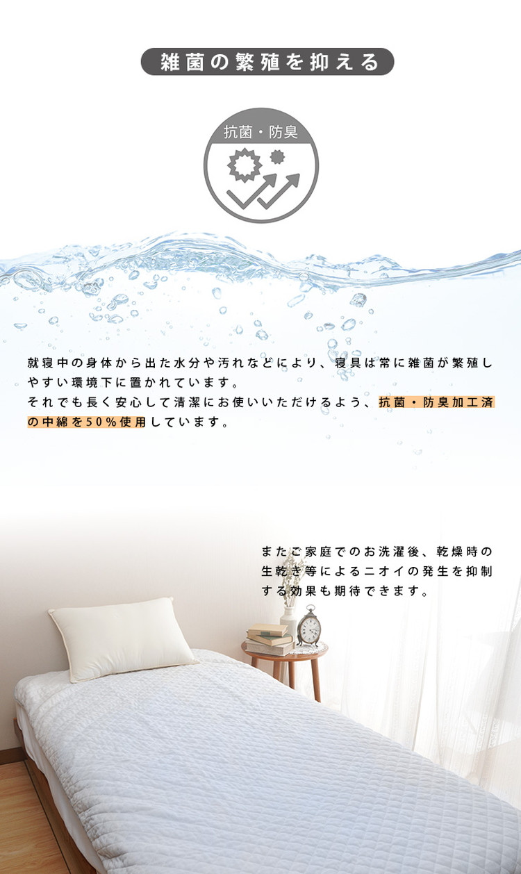 ふんわり軽やかな中わたは抗菌防臭効果も期待でき、ご家庭でまるごとお洗濯ができるので、シーツやカバーなしでもお使いいただけます。