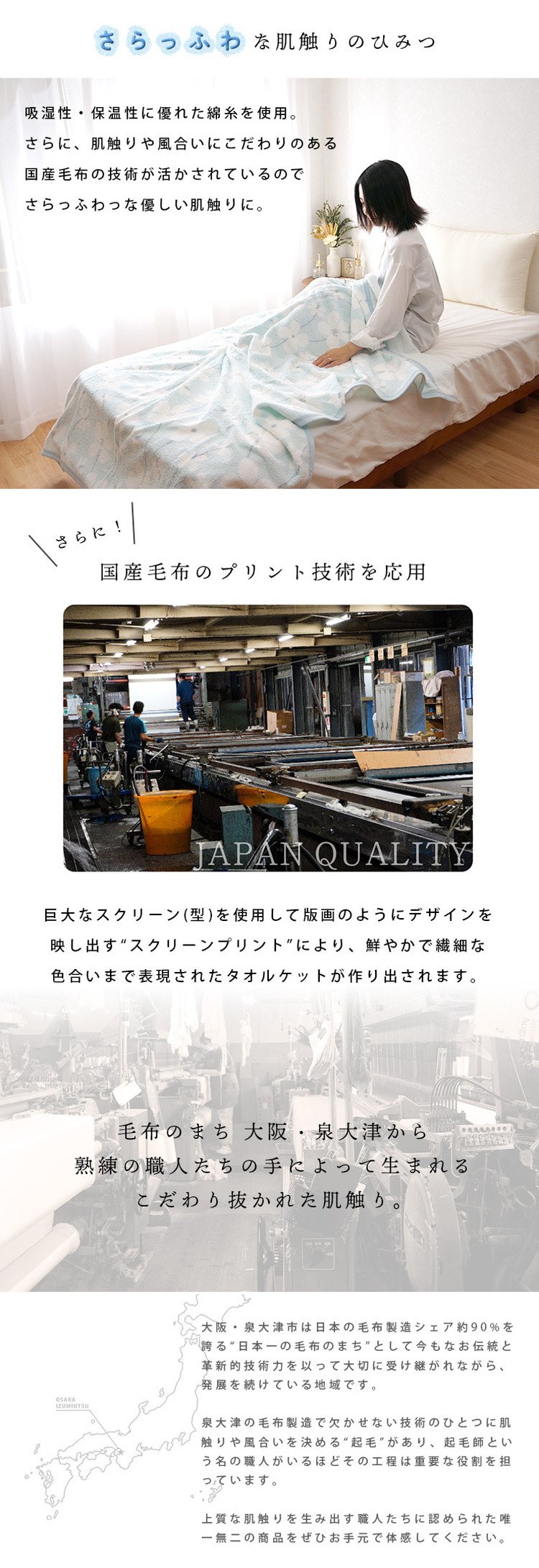 編み立てから各種の仕上げ・縫製等を毛布の町・泉大津で行っており、日本毛布工業組合が定めた品質基準をクリアしています。