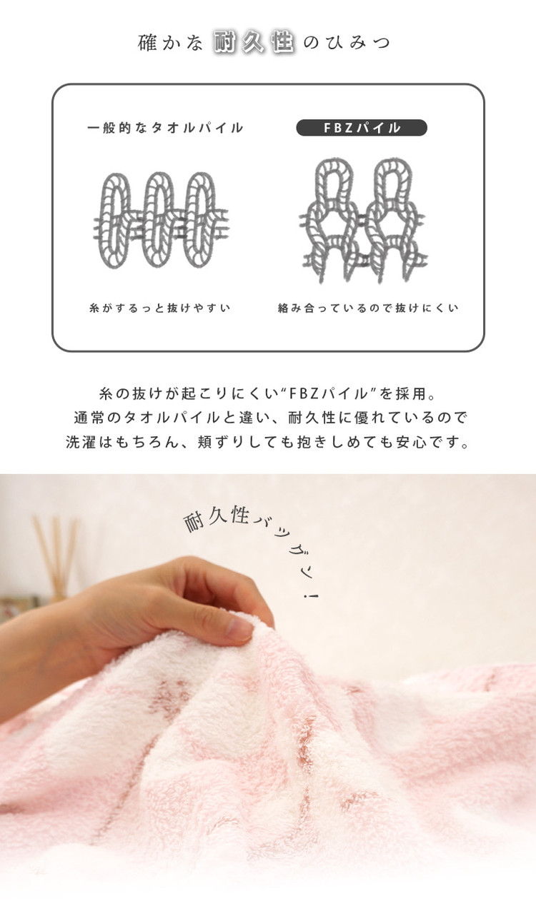 糸が抜けにくく耐久性に優れたFBZパイル仕立てのタオルケットです。