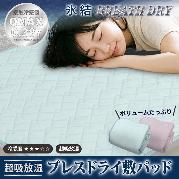 氷結ブレスドライ敷パッドは放射熱に優れているので熱をためにくく、寝返りのたびにひんやりさらっと感が心地いい夏向けの敷パッドです。