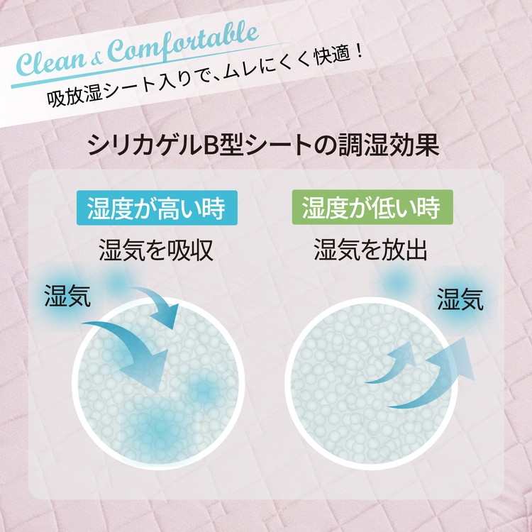 敷パッドの中材に吸放湿性に優れたシリカゲルB型シートを採用。呼吸するかのように湿度を調整してくれるので、ムレにくく快適な敷パッドです。