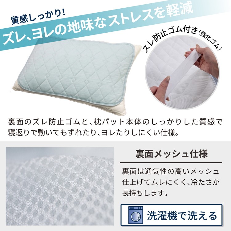 枕パッド裏面のズレ防止ゴムと、しっかりした厚みがあるので動いてもずれにくい枕パッドです。強化ゴム仕様でのびにくく、長くご愛用いただけます。