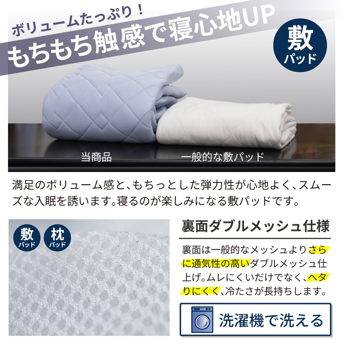 敷パッド、枕パッドの裏面はダブルメッシュ仕様で通常のメッシュ仕様よりも通気性に優れ、さらにムレにくい仕様。ズレ防止ゴムと、しっかりした厚みがあるので動いてもずれにくい。