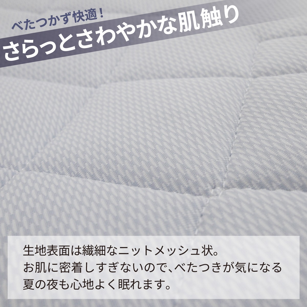 ケット、枕パッド、敷パッドの生地表面はお肌にまとわりつきにくい繊細なメッシュニット状でさらっと心地いい肌触り。
