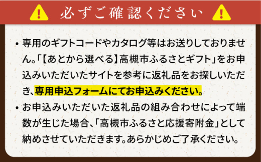 ・専用のギフトコードやカタログ等はお送りしておりません。「【あとから選べる】高槻市ふるさとギフト」をお申込みいただいたサイトを参考に返礼品をお探しいただき、専用申込フォームにてお申込みください。