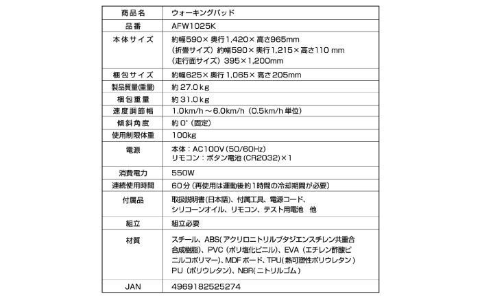 | 容量 | 商品名:ウォーキングパッド 品番:AFW1025K 本体サイズ:W590×D1,420×H965mm 折りたたみ時サイズ:W590×D1,215×H110mm ベルトサイズ:W395×D1,200 本体質量(重量):約27.0kg 梱包サイズ:W625×D1,065×H205mm 梱包質量(重量):約31.0kg 使用体重制限:100kg 連続使用時間:60分(使用後本体冷却目安期間約1時間必要) 電源:本体:AC100V(50/60Hz) リモコン:ボタン電池(CR2032)×1 消費電力:550W 速度調整:1.0~6.0km/h(0.5km/h刻み) 傾斜角度:約0°(固定) 材質:スチール、ABS(アクリロニトリルブタジエンスチレン共重合合成樹脂)、PVC(ポリ塩化ビニル)、EVA(エチレン酢酸ビニルコポリマー)、MDFボード、TPU(熱可塑性ポリウレタン)、PU(ポリウレタン)、NBR(ニトリルゴム) 付属品:リモコン、シリコーンオイル、ボタン電池(テスト用)、付属工具、取扱説明書 JAN:4969182525274 ※玄関先でのお渡しとなります。サイズ、重量をご確認の上お選びください。 ■アルインコアフターサービスのご案内 初期不良・修理・組立方法・使用方法など商品に関するお問い合わせは、下記メーカー直通サービスセンターにて受け付けております。ご連絡の際は「ふるさと納税の返礼品である旨」「品番または商品名」をお伝えいただけますとスムーズに対応させていただけます。 ・アルインコサービスセンター フリーダイヤル 0120-30-4514 10:00-12:00/13:00-16:00(土日祝を除く) mail fcs-syuuri@alinco.co.jp FAX 072-678-6410 ・フリーダイヤルに接続できない場合 一般回線 072-677-4527 10:00-12:00/13:00-17:30(土日祝を除く) ※アルインコHP内フィットネス事業部お問い合わせフォームからも受け付けております。 |