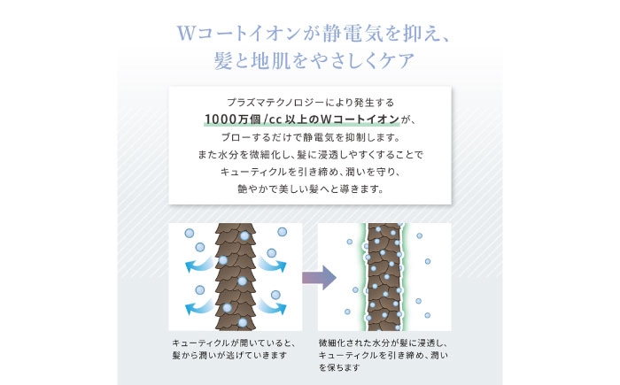 Wコートイオンが静電気を抑え、髪と地肌をやさしくケア